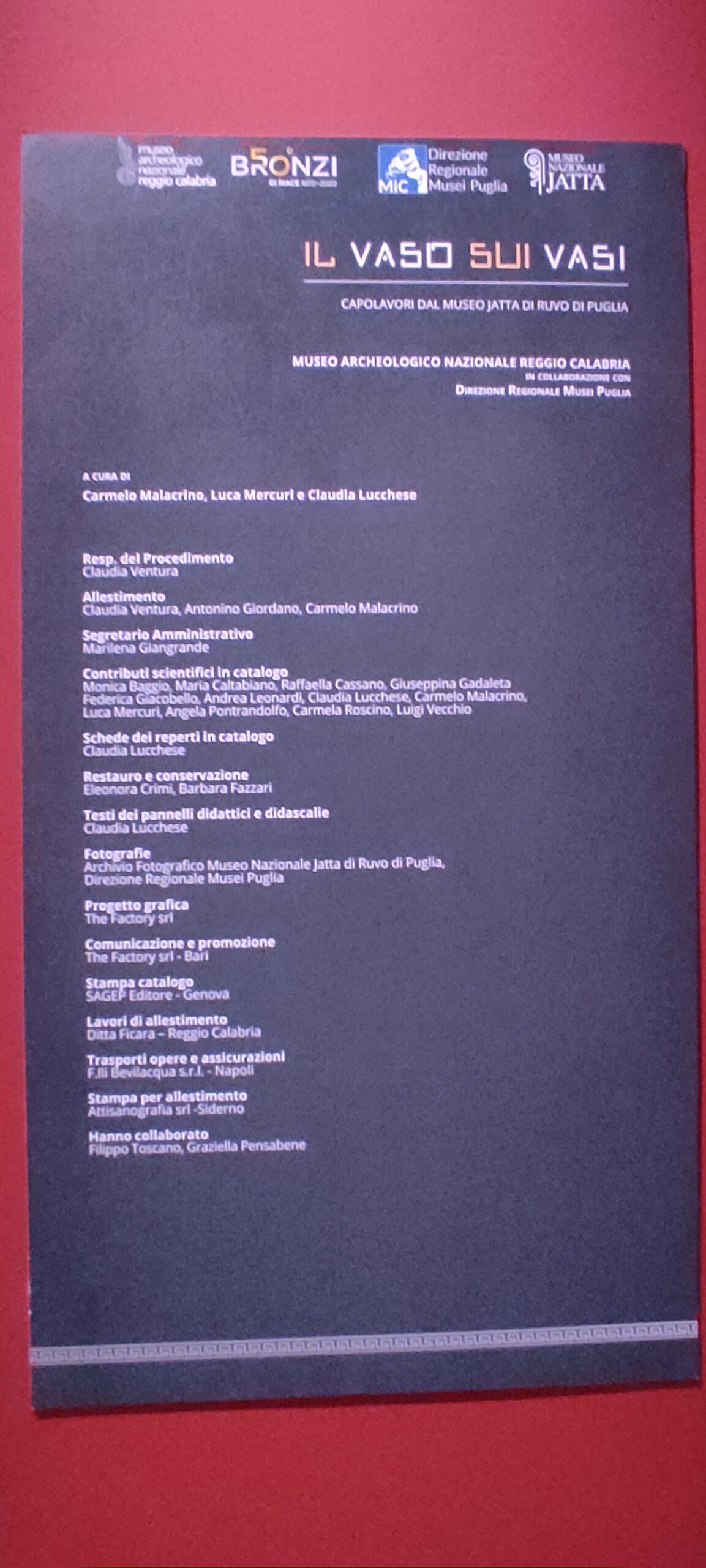 Il progetto deriva da una sinergia del MArRC con la Direzione Regionale Musei Puglia, e si inserisce nelle celebrazioni del Cinquantesimo anniversario della scoperta dei Bronzi di Riace. Il percorso si snoda in quattro sezioni, “Il rito del vino”, “I guerrieri della Peucezia”, “I vasi delle donne” e “Offerte per i defunti”, con riferimento ai tanti aspetti sociali che connotano le comunità indigene della Puglia centro settentrionale tra il V e il IV secolo a.C. In fieri la pubblicazione del catalogo che preannuncia riflessioni dense e concrete.