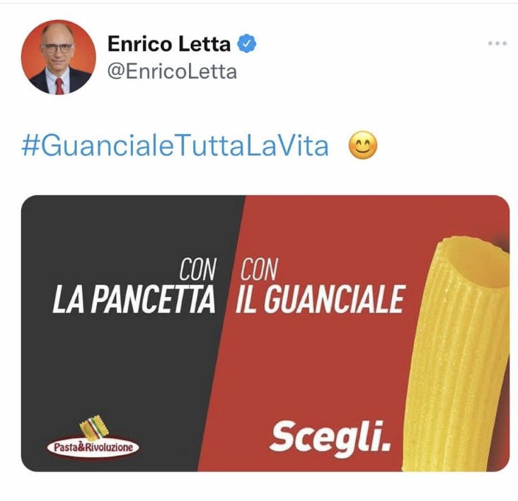 È anche il giorno in cui Enrico Letta posta su twitter il manifesto parodia “pancetta o guanciale, scegli” che fa il verso a tanti altri manifesti del pd Putin/ Europa, sottopagato /salario minimo, combustibili fossili/ energie rinnovabili. Sulla traccia della famosa diatriba su come risulti più saporita la carbonara, cioè con uno o con l’altro ingrediente, Letta ha risposto: “Guanciale tutta la vita”, e ha ritwittato il manifesto. Quando la campagna elettorale diventa una ricetta. Matteo Salvini risponde con un altro aut-aut: torno in Francia/resto in Italia, con questa frase: cosa farà Letta dopo il 25 settembre? Mannaggia, però, a postare cibo il leader della Lega è sempre stato insuperabile.