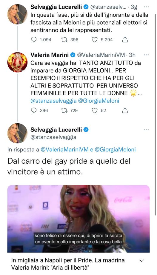 Screenshottato il tutto, la Lucarelli ha postato la foto su facebook: “Nuovi posizionamenti”, ha scritto, cui sono seguiti una valanga di commenti, al momento in cui ne prendiamo visione sono circa 18mila. Ne scegliamo qualcuno: “Ci mancavano i baci stellari alla Meloni”, che è la canzone eseguita sul palco di Napoli “Baci stellari, besame”. “Ci mancava qualcosa di importante in questa campagna elettorale”, “Valeriona nazionale”, “Tanto Meloni vince anche senza supporti”.