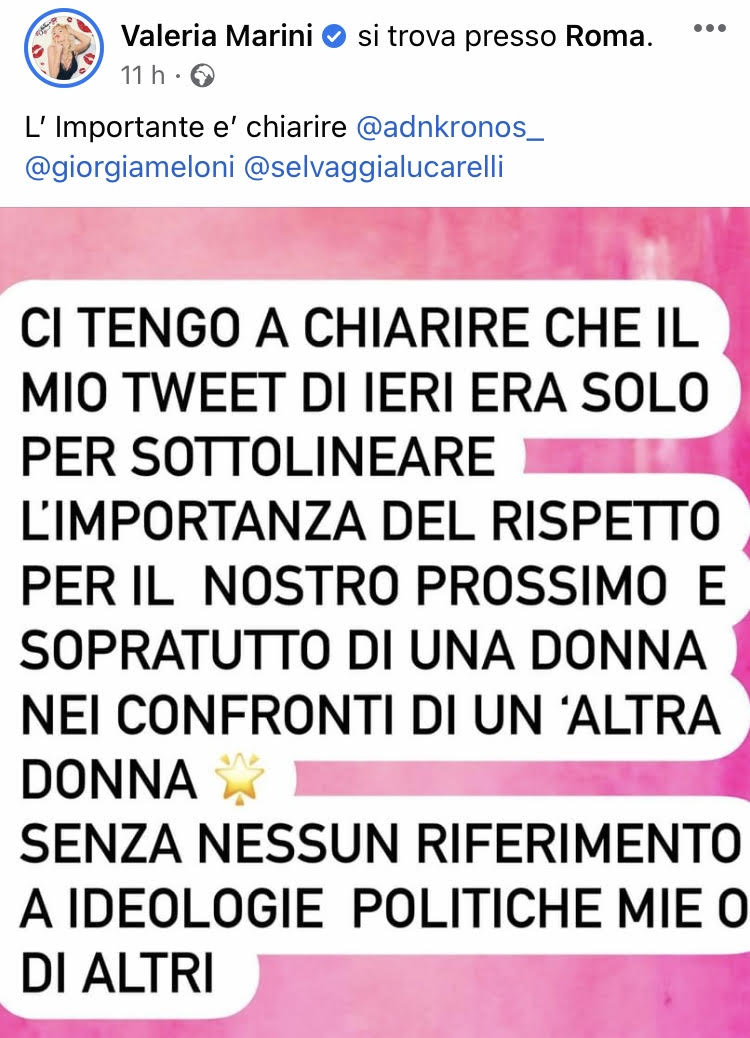 Ci sono soprattutto una miriade di plausi al pensiero espresso da Lucarelli. Marini ha precisato in un post dopo la lunga scia di polemiche: “Ci tenevo a chiarire che il mio tweet era solo per sottolineare l’importanza del rispetto per il nostro prossimo e soprattutto di una donna nei confronti di un’altra donna, senza nessun riferimento a ideologie politiche mie o di altri”.