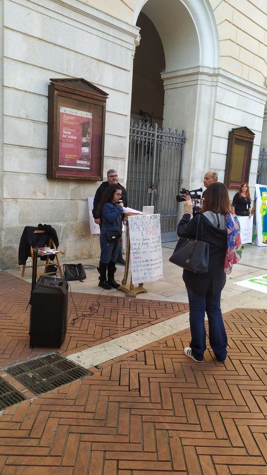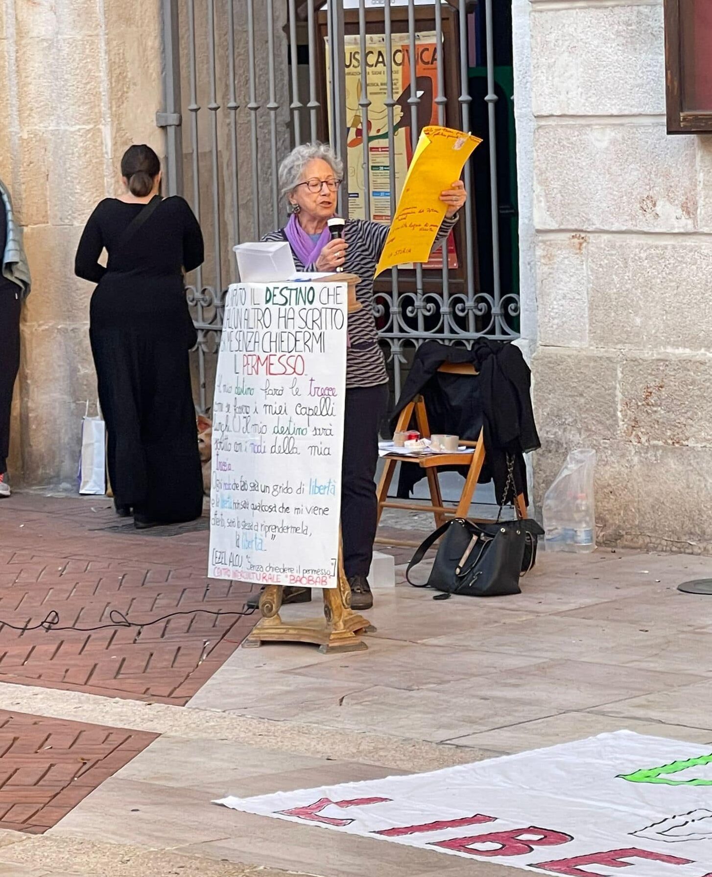 In piazza Lucia Aprile e Stefania Gramazio di “Società Civile”, l’associazione che ha organizzato il sit in di oggi, ragazze vestite di nero con un ampio velo colorato, immagini di cartapesta con il capricapo scuro, musica, poesia recitata da una ragazzina che dice: “Io rifiuto il destino che qualcun altro ha scelto per me senza chiedermi il permesso”.