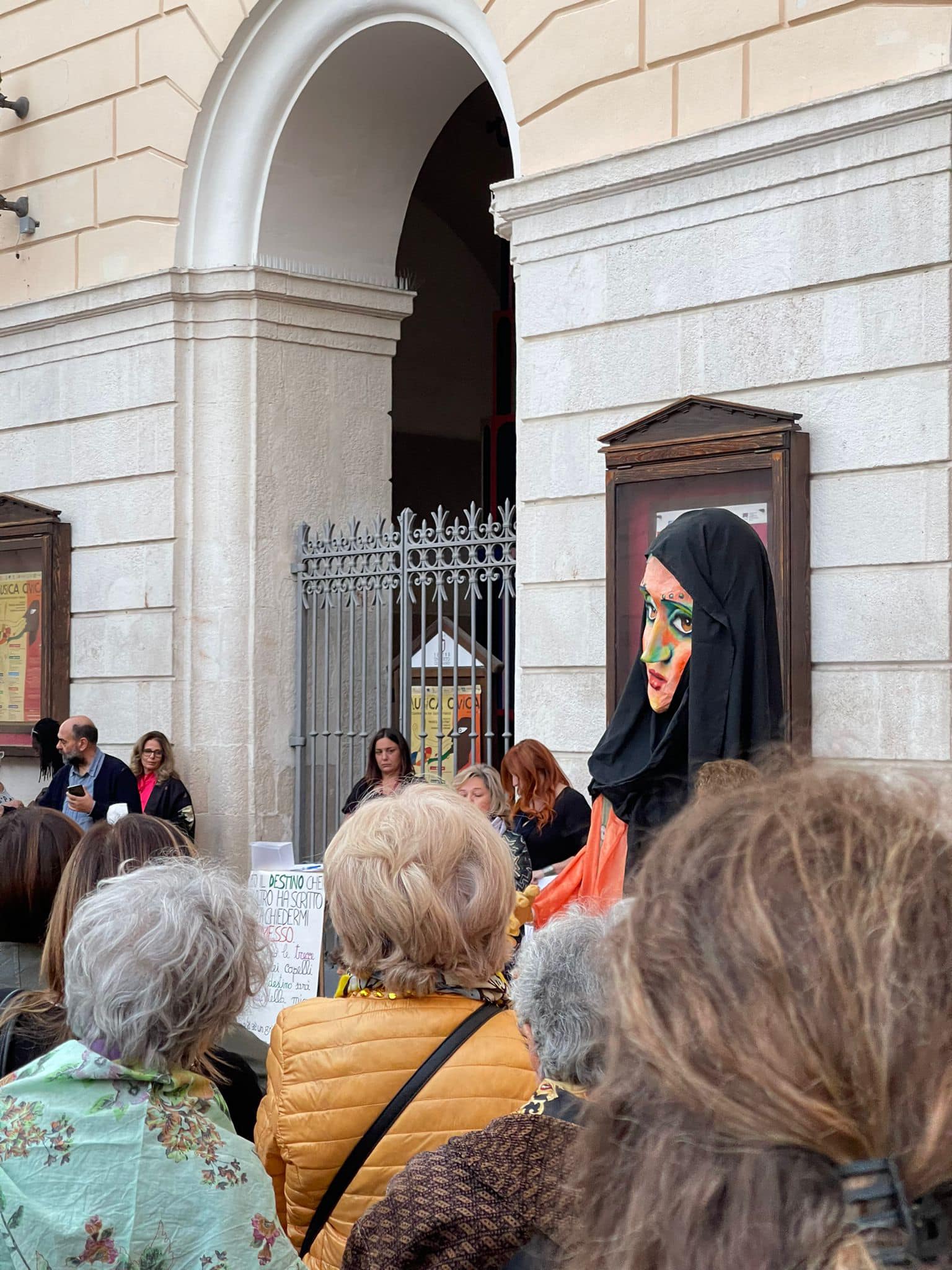 In piazza Lucia Aprile e Stefania Gramazio di “Società Civile”, l’associazione che ha organizzato il sit in di oggi, ragazze vestite di nero con un ampio velo colorato, immagini di cartapesta con il capricapo scuro, musica, poesia recitata da una ragazzina che dice: “Io rifiuto il destino che qualcun altro ha scelto per me senza chiedermi il permesso”.