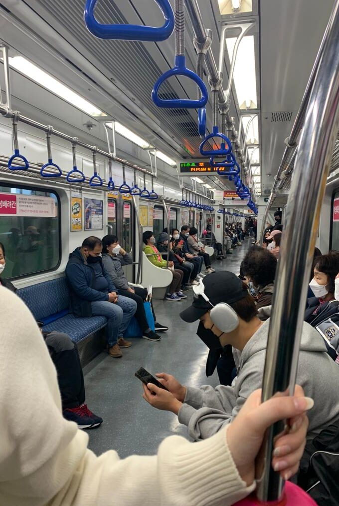 All’interno della metro, contrariamente all’Italia dove tutti parlano, ridono, urlano, è tutto super silenzioso, non si sente volare una mosca, mai. Stanno tutti coi telefoni in mano, e nessuno chiacchiera. Se per sbaglio arriva una telefonata, si risponde velocemente e si chiude, oppure non si riceve proprio. Molto spesso si nota gente che dorme, o le ajhumma (le signore anziane) con le pentole del kimchi, piatto tipicamente coreano, appoggiate sul sedile.