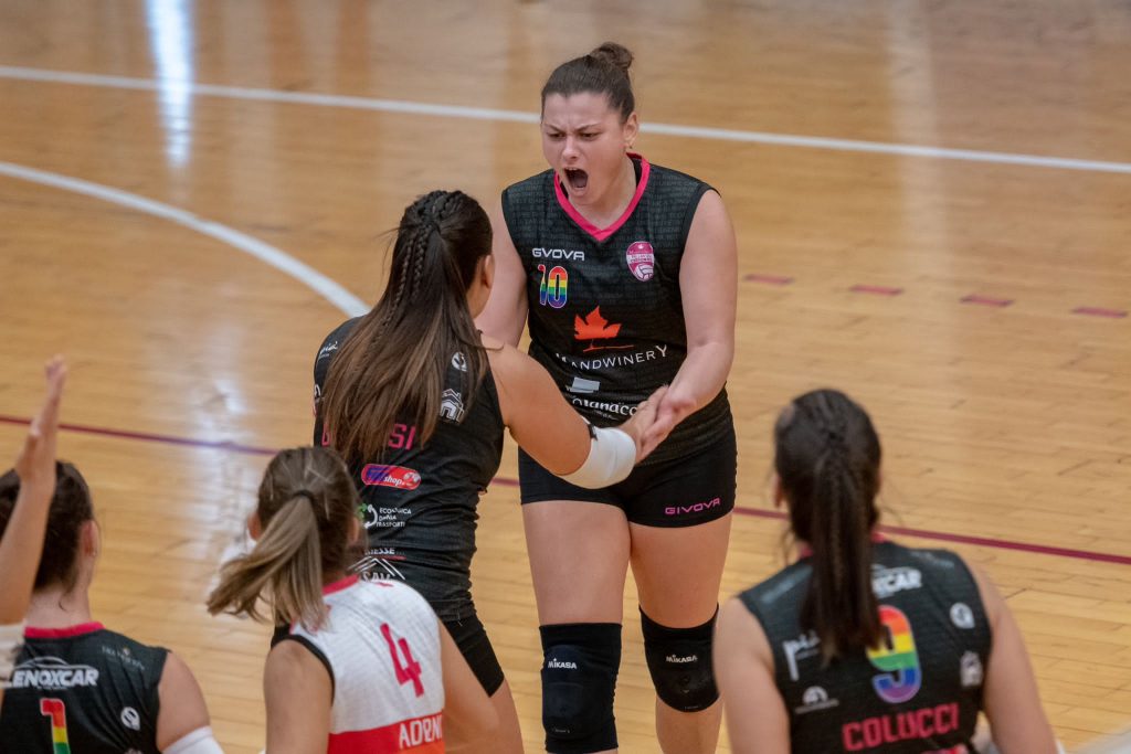 Nel mezzo, le solite magie di Maga Altomonte (suo lo splendido punto del 14-11) a smistare palloni per le bocche di fuoco fucsia, con Martinelli, Gervasi e la mai doma Simeone sugli scudi, e un muro che inizia a prendere le misure alle avversarie con Pettinari e Colucci.